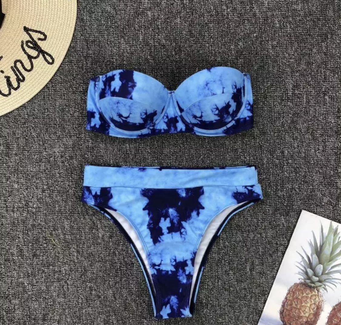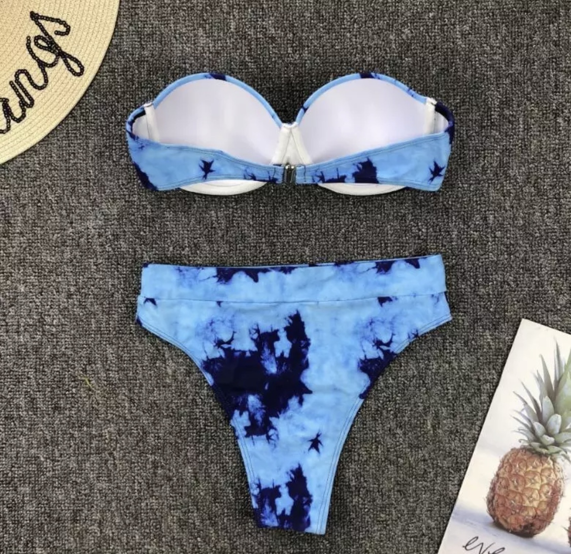Bikini Estampado desteñido en Azul, sujetador y braguita alta